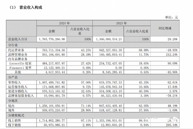 根据其财报显示,2024年,若羽臣品牌管理业务实现营业收入5.01亿元,同比增长212.24%,占整体营收的比例从上年的11.75%上升到28.38%;自有品牌业务实现营业收入5.01亿元,同比增长90.28%,营收占比从上年的19.28%上升至28.37%;代运营业务实现营业收入7.64亿元,同比下降18.95%,占营业收入比重也从上年的68.98%降至43.25%。