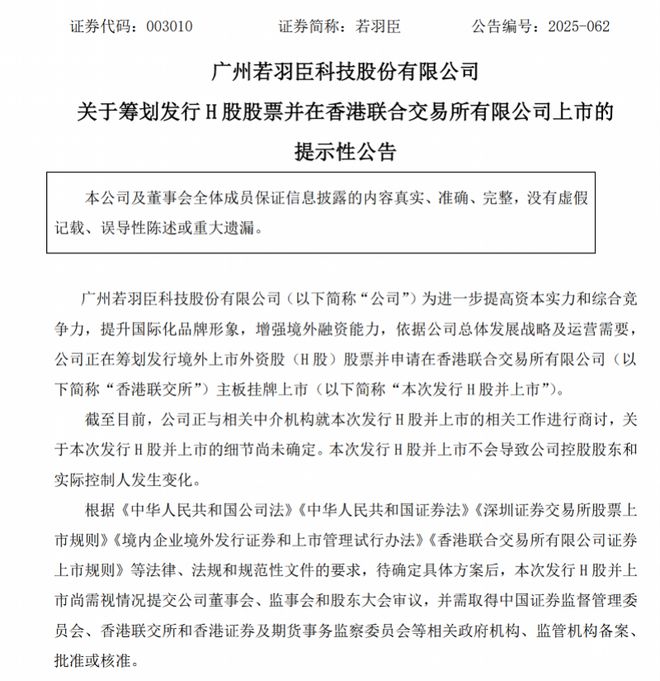 8月6日,若羽臣发布公告,公司正在筹划发行境外上市外资股(H股)股票并申请在港交所主板挂牌上市,目前正与相关中介机构进行商讨,发行细节尚未确定。