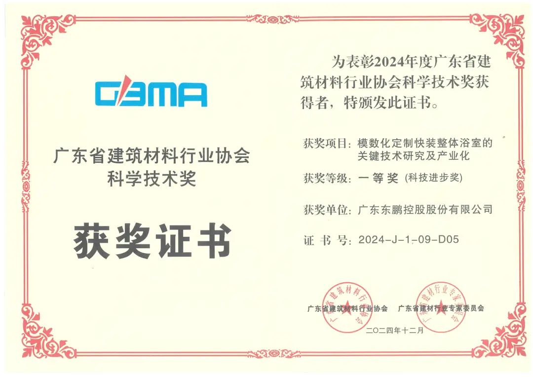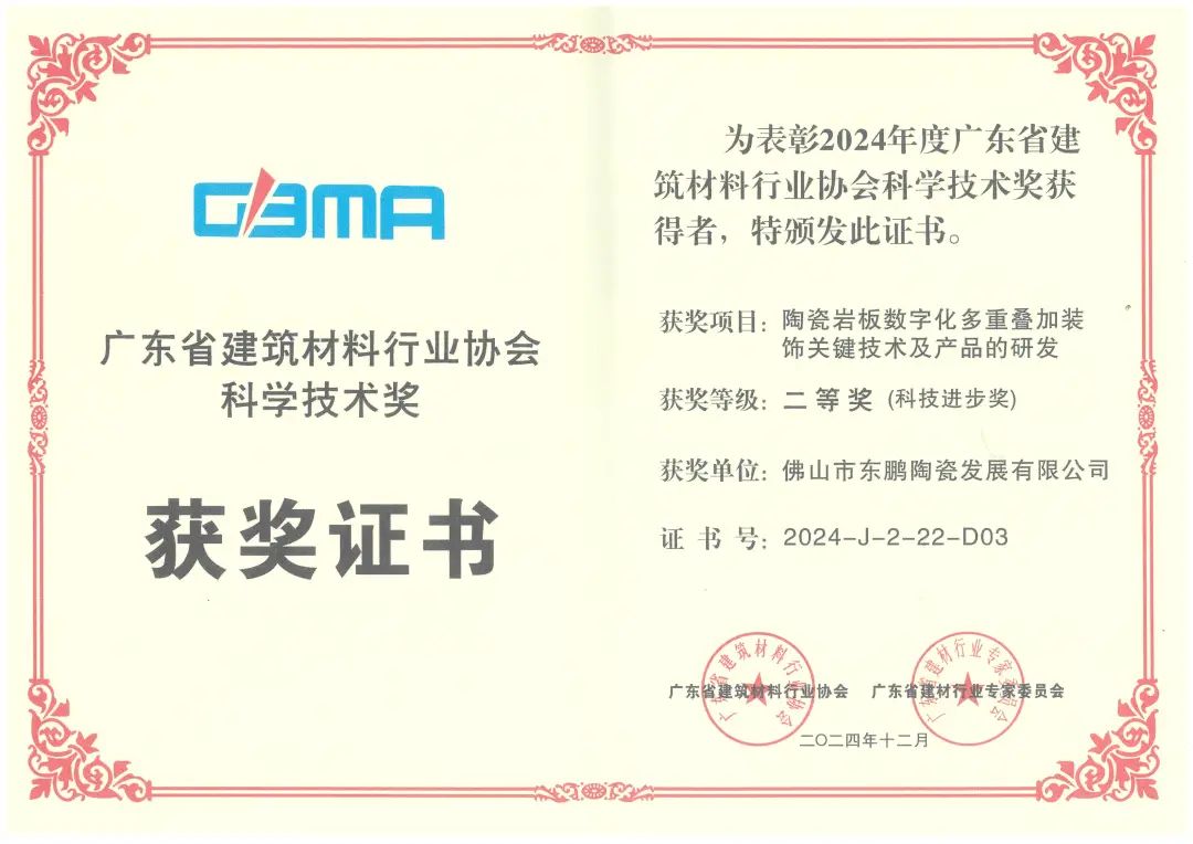 东鹏控股以“数字驱动,智造未来”战略为引领,持续推进全链条数字化转型,在智能制造与研发创新领域成果丰硕。本次大会,公司凭借“模数化定制快装整体浴室的关键技术研究及产业化”项目斩获广东建筑材料科学技术奖科技进步一等奖,“陶瓷岩板数字化多重叠加装饰关键技术及产品的研发”项目荣获科技进步二等奖。