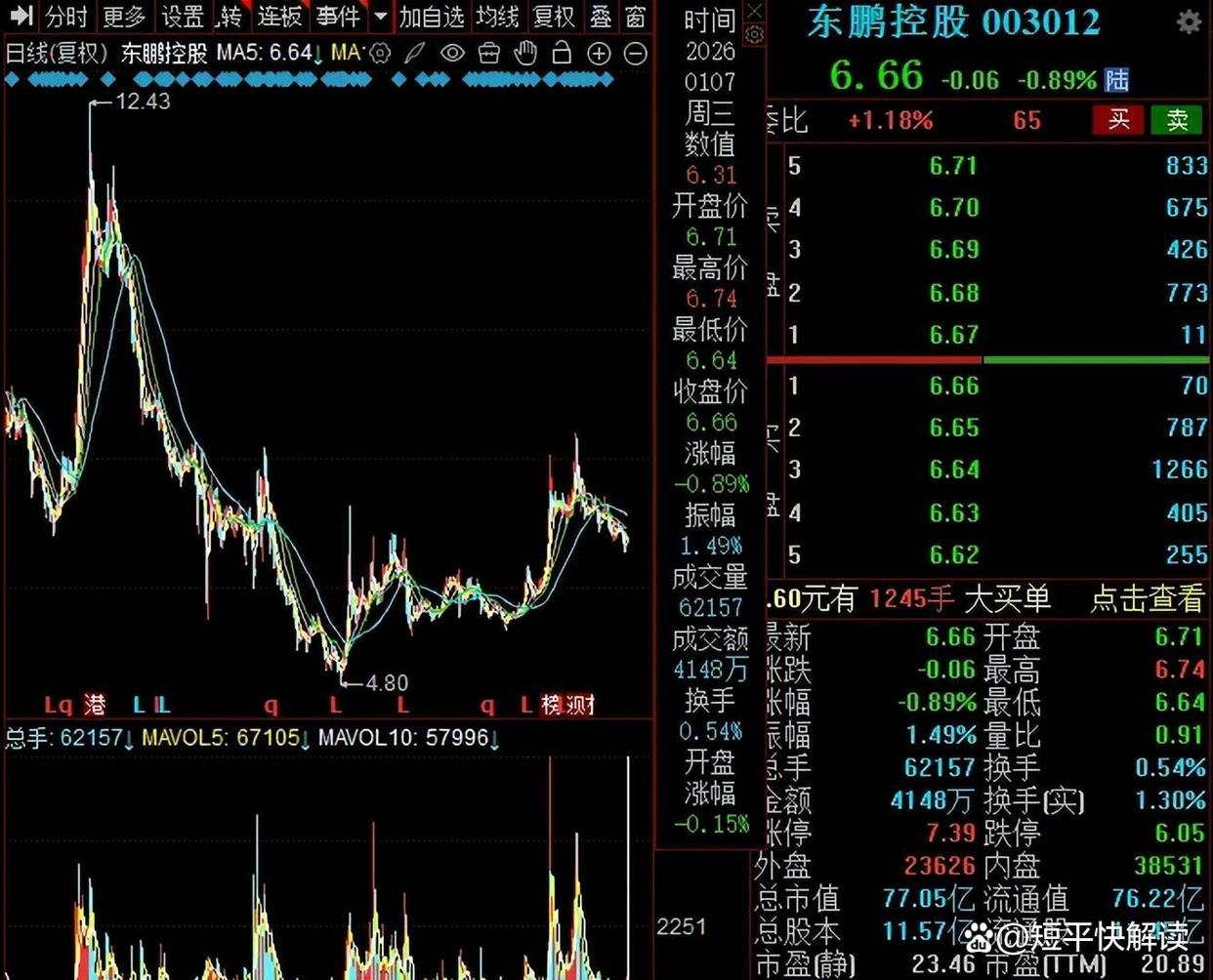 股价大跌,机构、散户均有所减少。二级市场上,东鹏控股股价下滑较为明显,从2023年12.43元/股(前复权,下同)的高点下滑至4.8元/股的低点,随后有所反弹,截至1月7日收盘,股价为6.66元/股,较高点下跌约46%,目前总市值不足百亿元,为77.05亿元,TTM市盈率20.89%,考虑到房地产业现状以及公司收入下滑的情形,估值并不算太低。