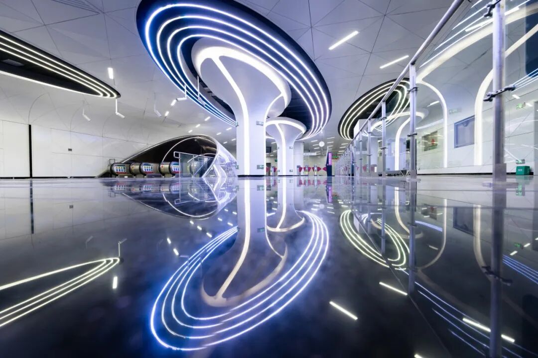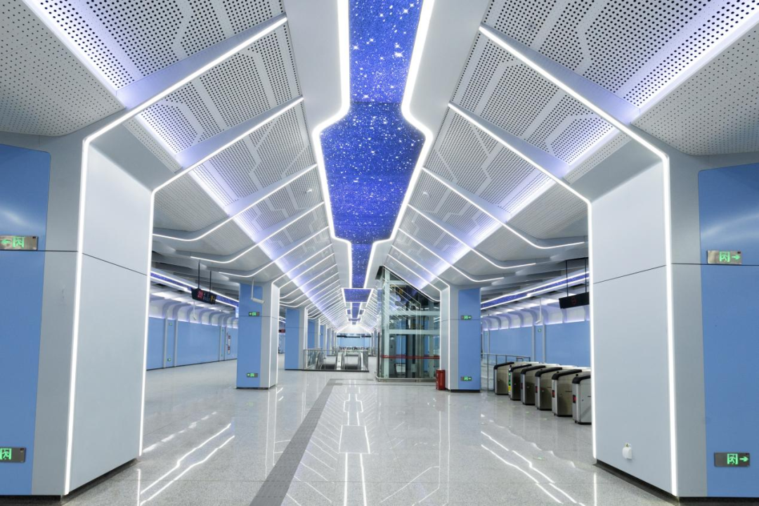 航天城站以“慧聚云端、展翼载梦”为主题。提取腾飞的翅膀作为空间设计元素,天花采用铝方通结合冲孔铝板,以阵列组合的形式出现,犹如大鹏展翅,寓意自由、力争向上。中部透光膜布模拟出星空的效果,结合蓝色烤瓷铝板墙柱面,天地墙一体化整体设计,科技感十足。