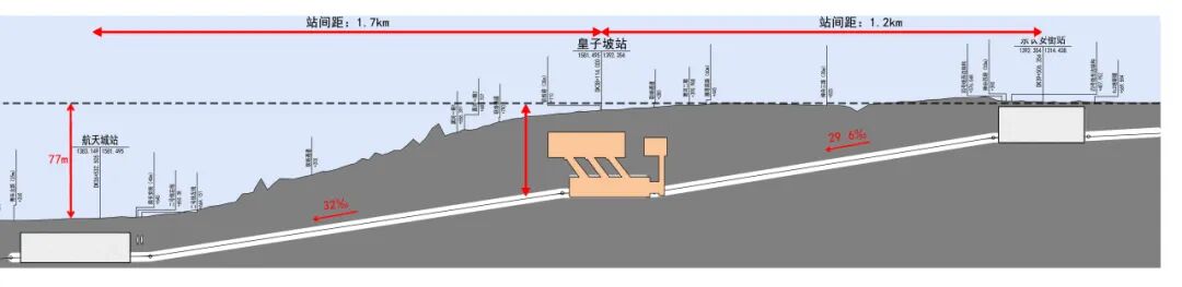 十五号线航天城站与东长安街相距2.9Km,分别与既有2、4号线换乘,两站地面高差达74m,自然坡度达43.5‰,在该地段增设车站面临地形高差悬殊、深厚黄土层、穿越输水隧洞等多重挑战。设计过程中,针对超过30‰的线路坡度开展长大纵坡专题研究,系统论证了大坡度下的行车安全与应急救援方案。