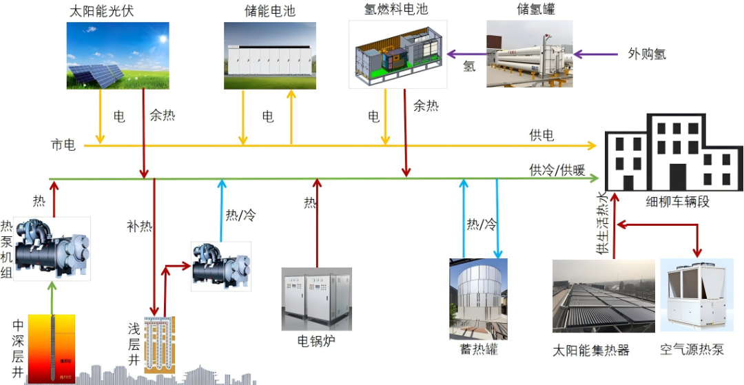 作为西安十五号线的核心配套,细柳车辆段氢赋能零碳智慧能源中心示范项目,是国内轨道交通领域首个“零碳”车辆段标杆,项目构建了多能互补的清洁供能体系,核心由能源交换站、氢能站、储能电池、地源热泵井及既有光伏系统组成。清洁电能来自 6.9MW 太阳能光伏与 1.2MW 氢燃料电池,搭配 5MWh 储能电池保障供电稳定;供热则优先利用 1MW 氢燃料电池余热与 0.5MW PVT 余热,再通过 5.63MW 高温+ 3.2MW 常温地源热泵(含 6 口深井、481 口浅井)补充,3MW 电锅炉负责调峰,实现供冷、供热、供电全链条零碳。