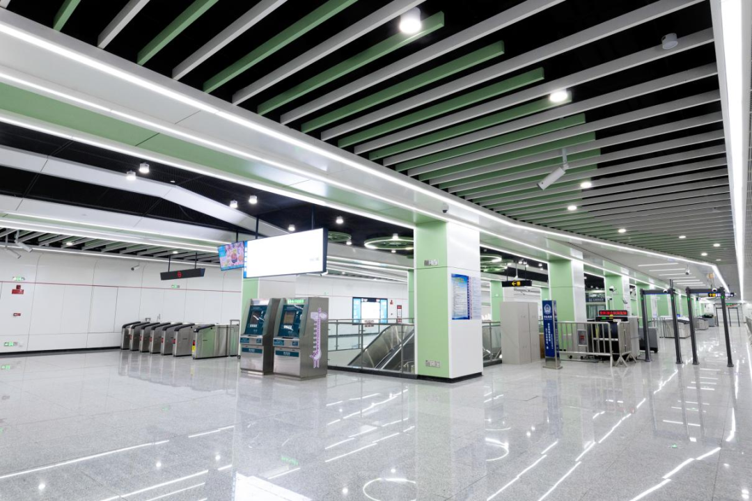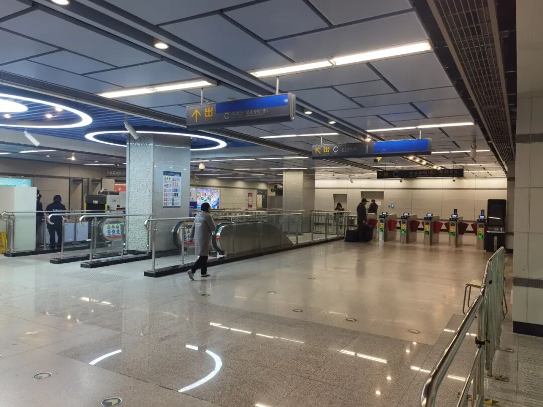 同时两线采用通道换乘,换乘距离约285米,通道设计以人为本,克服了拆迁难度大、近距离侧穿2号线区间隧道、交通疏解、管线迁改、出入口改移等方面困难,设置了全地下换乘通道,通道内设置了2部自动步道、4部扶梯提升换乘效率,大幅提升了乘客换乘的便捷性与舒适性。