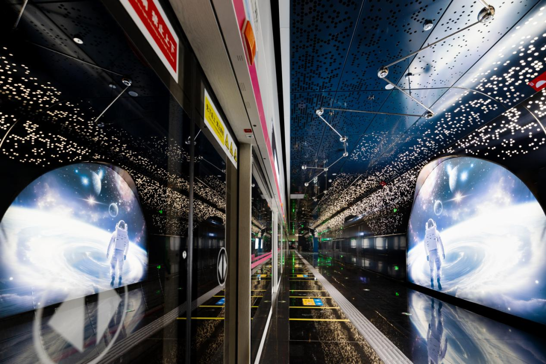 皇子坡站是西安埋深最大的分离岛式车站。装修设计以“逐梦九天,尖端赋能”为主题。站厅层天花以白色基调为主结合简洁干净的椭圆线条融合金属艺术装置,地面采用黑金砂花岗岩,整个站厅形成鲜明对比。结合车站的土建空间特点,站厅到站台的长通道中建筑装修与声光电进行一体化设计,使人在此驻留期间犹如穿越时空隧道。暗挖站台用蓝灰色烤瓷铝板包裹,结合顶部灯光、墙面文创、艺术座椅共同营造出深邃、神秘、引人遐想的艺术环境。