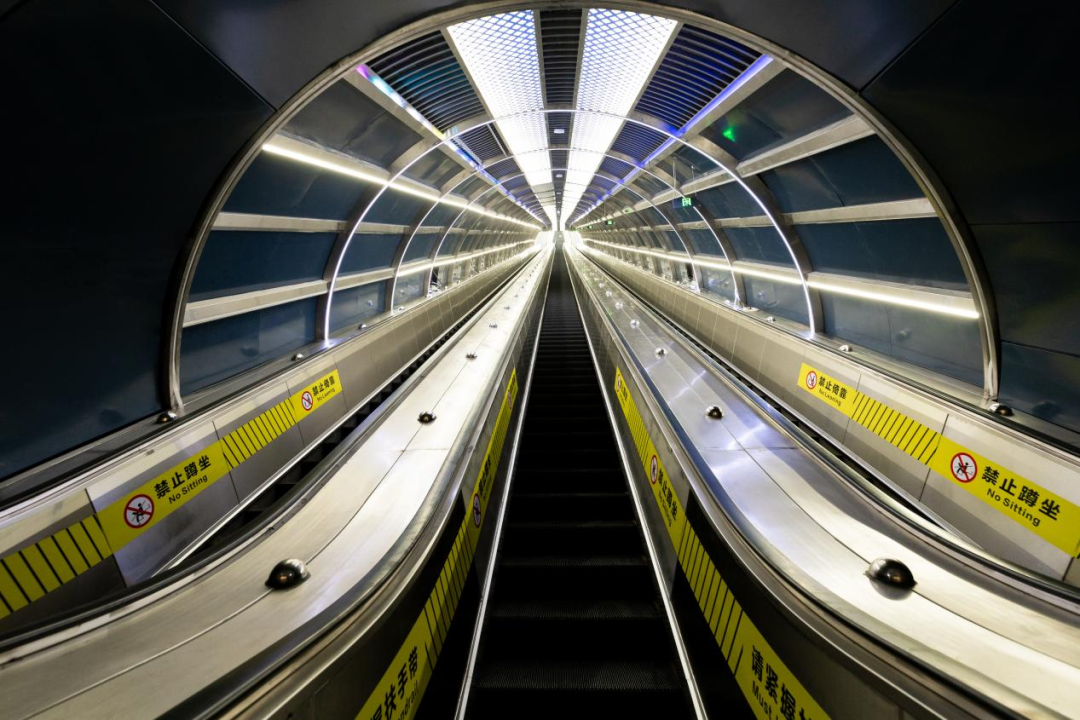 结合湿陷性黄土地质特点,综合比选深层明挖、PBA等工法,创新采用“厅台分离、明暗结合”的车站方案,有效化解47.5米超深车站施工风险;通过设置倾斜角27.3度、提升高度30米、长度69.1m的重载型扶梯,解决大高差带来的乘降不便;首次在西安地铁应用贴附送风技术,提升站台通风效率与空气品质。通过专项设计与技术攻坚,我国黄土地区埋深最大的皇子坡站得以顺利建成并投入运营。