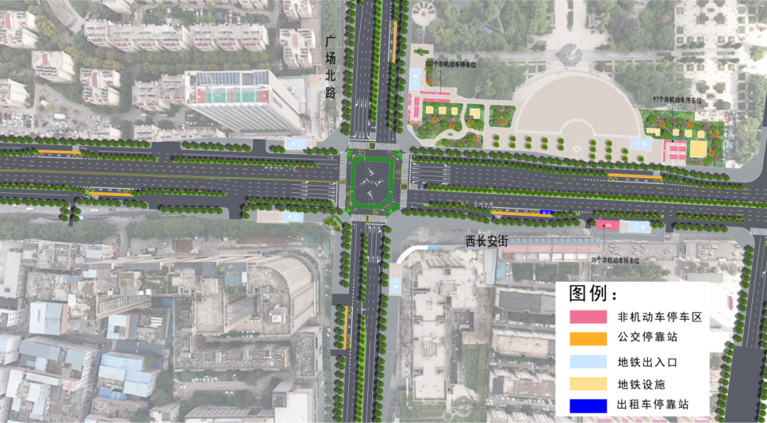 秉承这“建地铁就是建城市”的理念,西安地铁15号线对站点周边及沿线道路进行了提升改造,改造长度约14.9km。包含郭杜西站、郭杜站、樱花广场站等9处地铁站点微改造;项目通过“打通两处瓶颈路段、改造沿线交叉路口、完善全线慢行体系、更新地下老旧管网、增设智慧交管设施、地铁微中心一体化”六大举措,秉着“地上--张图、地下一张网,五位一体”统筹建设的理念,对沿线道路实施整体提升改造。