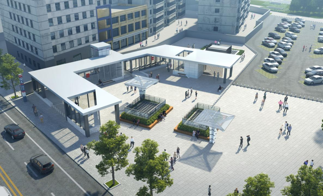 充分挖掘并利用车站外部空间资源,系统优化站点周边人居环境,创新性地以车站附属设施为核心构建站点“微中心”。以郭杜站为例,该站点依托出入口、风亭等地面构筑物形成的围合空间打造城市微中心,通过整合地面建筑,有效强化空间整体性。平面布局上,采用“U型”庭院围合设计,庭院中心配置核心景观、休闲座椅、遮阳设施等,显著提升场地向心性与活力。在保障市民便捷乘车的基础上,为周边社区提供兼具街角公园功能的休闲活动场所。此外,微中心同步配套建设P+R停车场、非机动车停放区、公交与出租车便捷接驳点及机非车辆充电设施等便民服务载体,实现轨道交通与城市空间景观的深度融合。