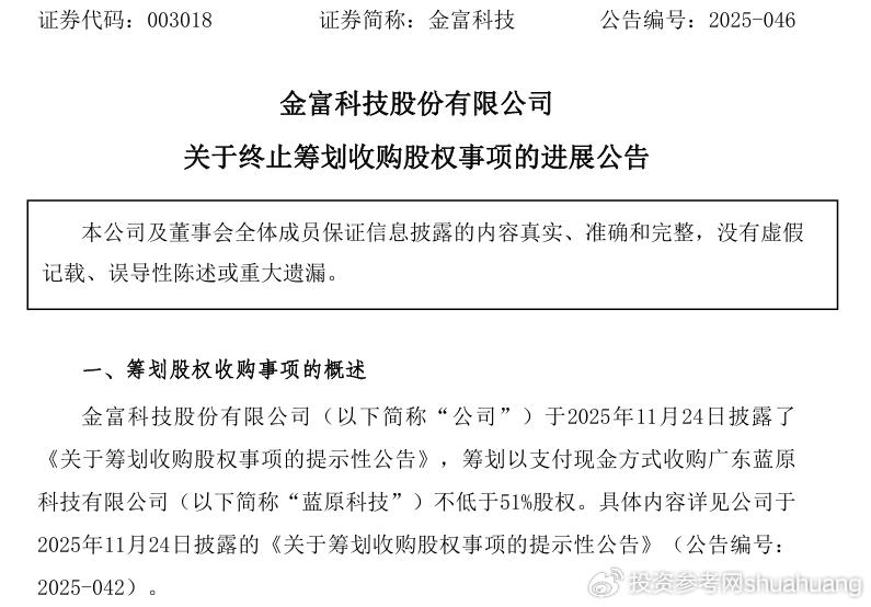“持仓的金富科技又跌了2.66%,从12月初的27块多跌到现在17块5.短短20多天浮亏快36%了!”12月26日收盘后,深圳某券商营业部的投资者李女士盯着屏幕上的K线图叹气,她在金富科技公告收购消息后追高买入,如今只能无奈持仓观望。同日晚间,金富科技(003018)正式发布公告,宣布终止筹划收购广东蓝原科技有限公司不低于51%股权,这场曾点燃市场热情的并购案,最终因关键条款谈不拢黯然收场。