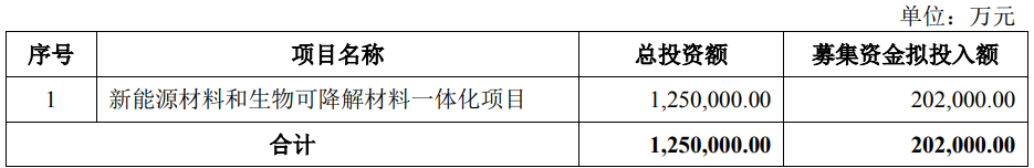 根据公司于今年8月8日发布的募集说明书(申报稿),公司本次拟向特定对象发行股票募集资金总额预计不超过20.2亿元(含本数),发行数量不超过267,113,600股(含本数),扣除发行费用后的募集资金净额拟投入新能源材料和生物可降解材料一体化项目。