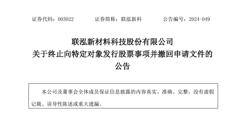 12月19日,联泓新科公告,综合考虑当前资本市场环境等因素,公司决定终止向特定对象发行股票事项,并主动向深交所申请撤回相关申请文件。