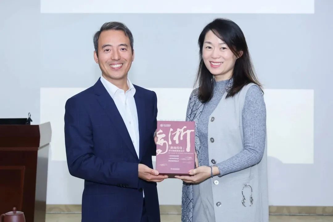 最后,王剑副主任代表浙江大学向徐董赠送了浙江大学管理学院名师著作《浙商传奇——书写创新创业史诗》书籍,徐董代表公司回赠了上市纪念品,印刻企业愿景“成为世界先进的半导体硅材料制造商”的展牌。