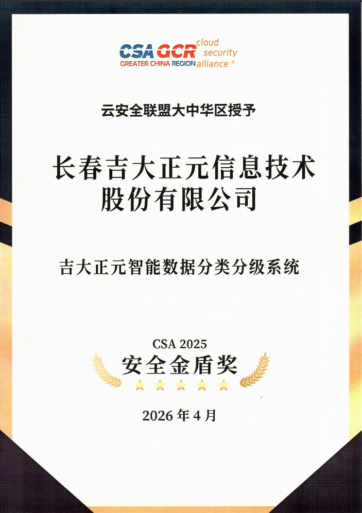 2026年4月2日,第九届CSA大中华区大会·前沿人工智能安全峰会在上海隆重举行。长春吉大正元信息技术股份有限公司(简称:吉大正元股票代码:003029)凭借自主研发的“智能数据分类分级系统”成功获评“CSA 2025安全金盾奖”,再次彰显了吉大正元在数据安全智能化赛道的行业领先地位。