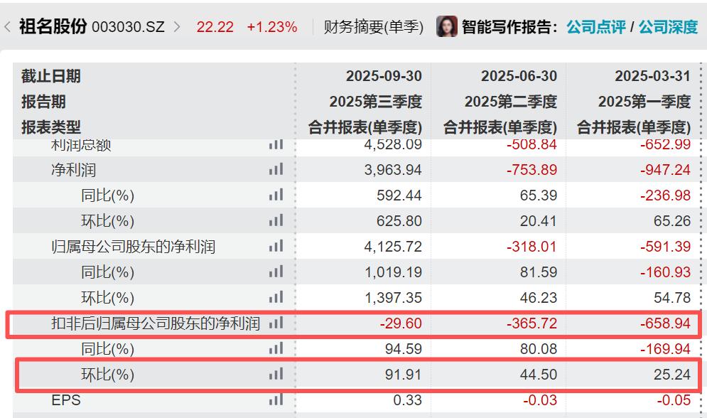 财报数据显示,祖名股份2025年第一季度、第二季度、第三季度的单季度扣非净利润分别为-658.94万元、-365.72万元、-29.60万元,亏损幅度不断缩小。