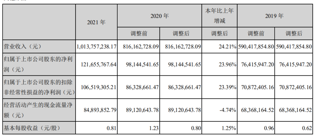 河北中瓷电子科技股份有限公司(以下简称“中瓷电子”或“公司”)发布2021年年度报告称:本报告期内,公司实现营业收入101,375.72 万元,较上年同期增长24.21%;归属于上市公司股东的净利润12,165.58万元,较上年同期增长23.96%。