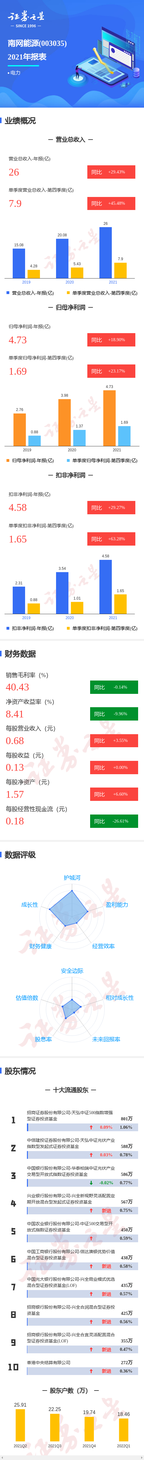 南网能源2021年报显示,公司主营收入26.0亿元,同比上升29.43%;归母净利润4.74亿元,同比上升18.9%;扣非净利润4.58亿元,同比上升29.27%;其中2021年第四季度,公司单季度主营收入7.91亿元,同比上升45.48%;单季度归母净利润1.69亿元,同比上升23.17%;单季度扣非净利润1.65亿元,同比上升63.28%;负债率52.72%,投资收益3583.99万元,财务费用2.01亿元,毛利率40.43%。