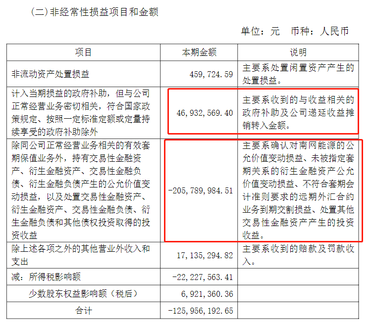 不过对于一季度扣非净利润增长超5倍的惊人数据,尽管特变电工表示,主要系一季度公司净利润大幅增长所致,但记者经过查询公告发现,该公司一季度投资南网能源亏损了约2.06亿元,被归入非经常性损益项目和金额……只能说市场太难,大企业金融投资也难逃亏损……