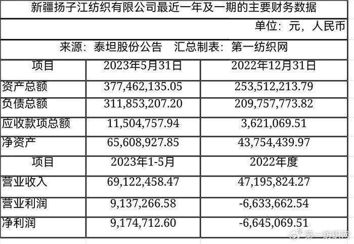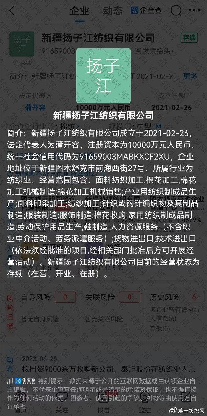 扬子江公司位于新疆图木舒克市,成立于2021年2月26日,经营范围涉及面料纺织加工、棉花加工、棉花加工机械制造、棉花加工机械销售、产业用纺织制成品生产、面料印染加工、纺纱加工、服装制造、服饰制造、棉花收购等领域。