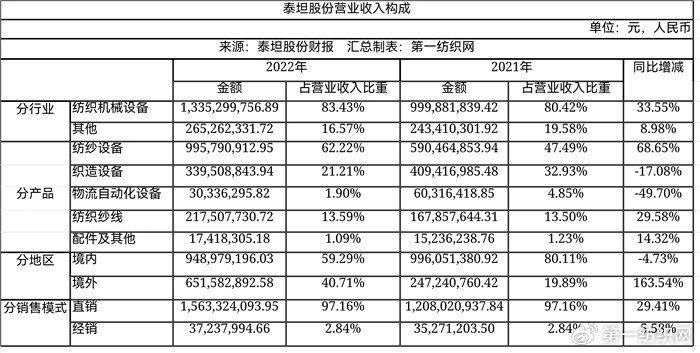 财报显示,2022年,在全球经济增长放缓的背景下,泰坦股份积极研发新机型、加强企业经营管理,加大产品市场开拓力度尤其是境外市场开拓力度,报告期内,公司实现营业收入16.01亿元,较上年同期增长29%,其中,实现境外销售收入6.52亿元,较上年同期增长164%;公司控股子公司阿克苏普美的纺织纱线产品产销两旺,其中纺织纱线实现收入2.18亿元,同比增长30%,同期,归属于上市公司股东的净利润为1.30亿元,同比增长79%。