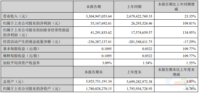 报告中显示,三和管桩上半年营收33.04亿元,同比上升了23.35%;归属于上市公司股东的净利润为5516.77万元,同比上升了109.81%。截止于2023年6月31日,三和管桩的总资产为59.26亿元,同比上涨了3.97%;归属于上市公司股东的净资产为17.8亿元,同比下降了0.78%。