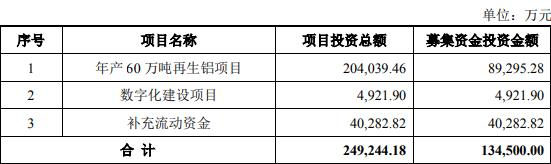 本次非公开发行股票募集资金总额不超过13.45亿元,在扣除发行费用后的募集资金净额全部用于年产60万吨再生铝项目、数字化建设项目、补充流动资金。