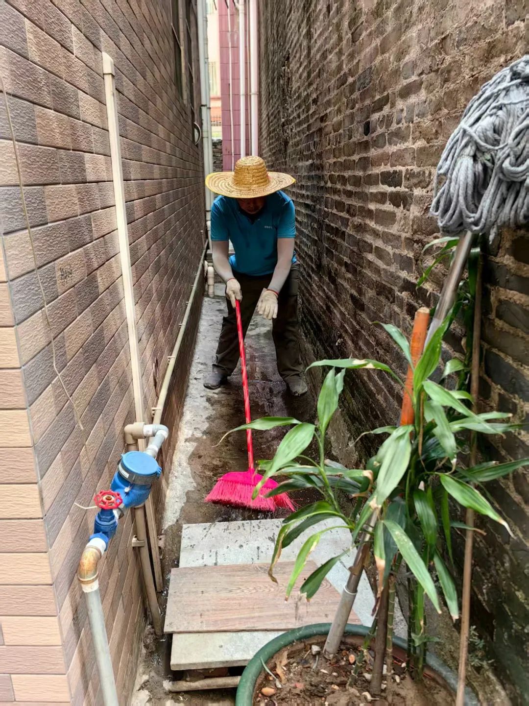 苏展鸿清理花盆积水。