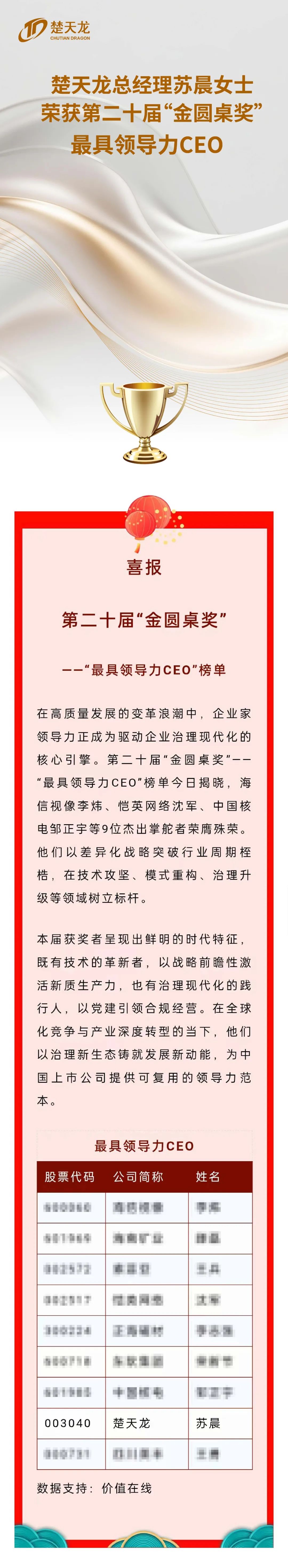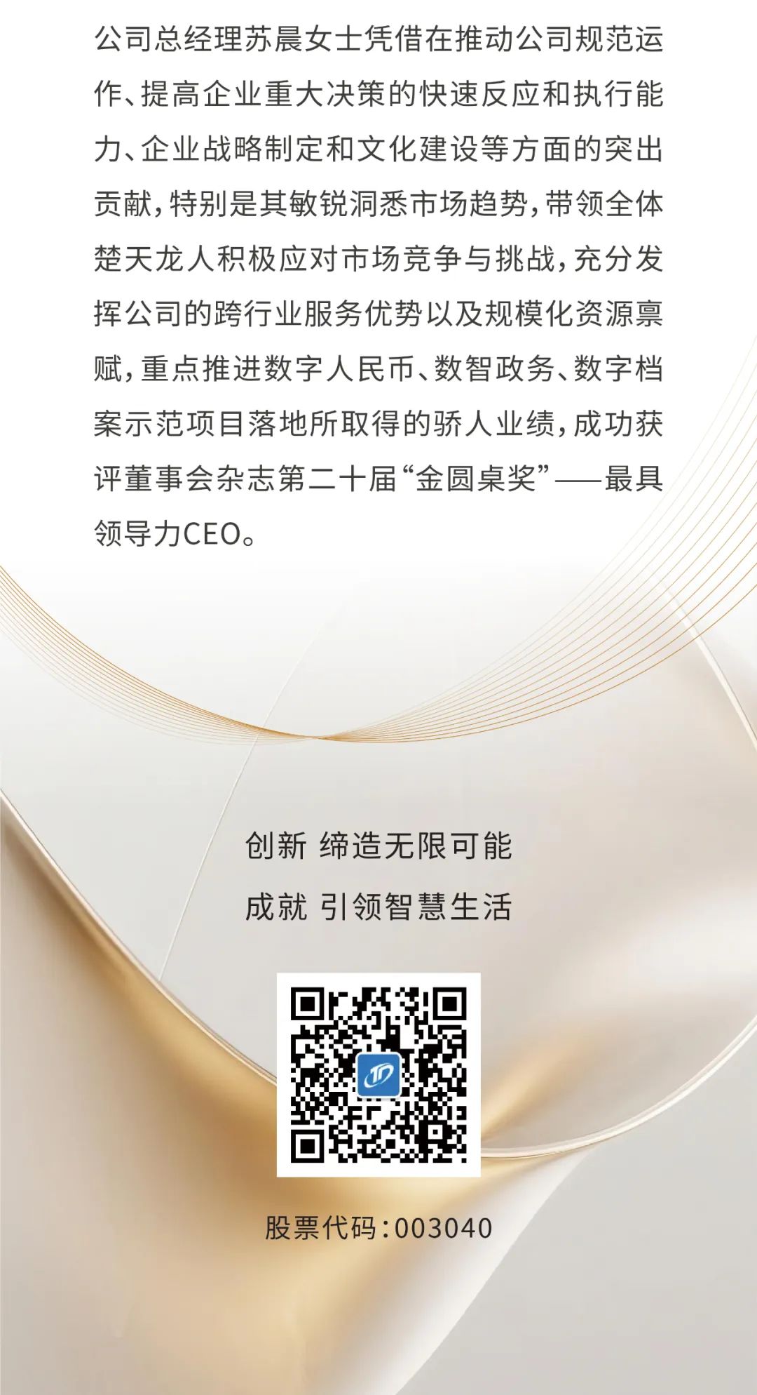 楚天龙总经理苏晨女士荣获第二十届“金圆桌奖”——最具领导力CEO