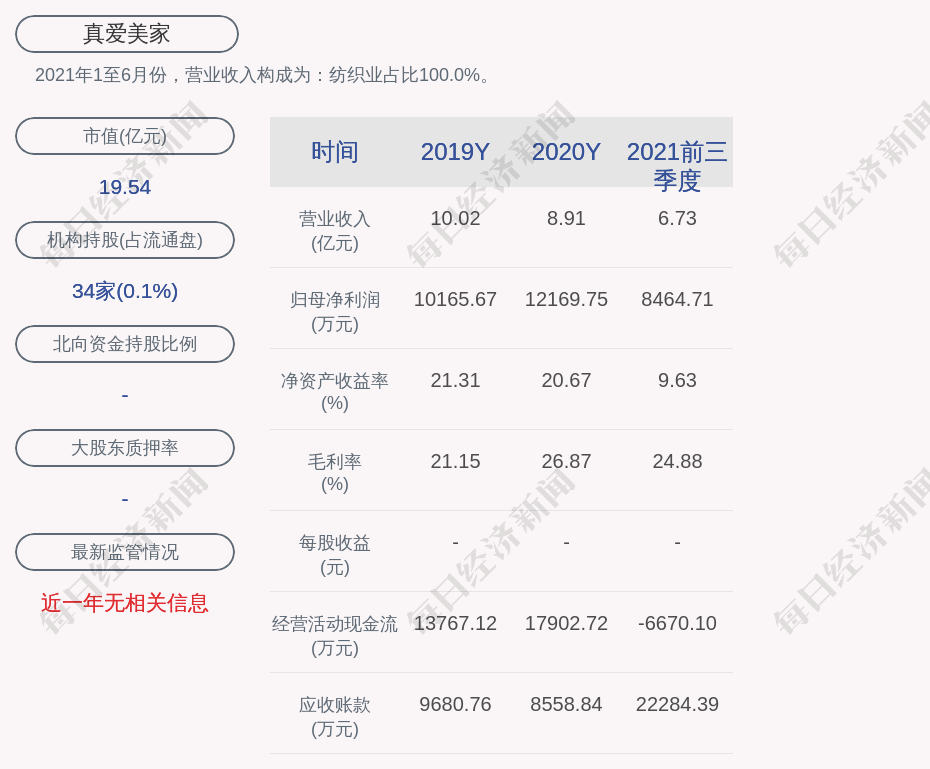 2021年1至6月份,真爱美家的营业收入构成为:纺织业占比100.0%。