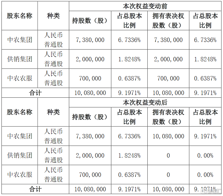 格隆汇8月31日丨中农联合(003042.SZ)公布,公司于2021年8月31日收到公司股东中国农业生产资料集团公司(“中农集团”)的通知,获悉在2021年8月31日中农集团分别与公司股东中国供销集团有限公司(“供销集团”)、中农集团现代农业服务有限公司(“中农农服”)签署了《表决权委托协议》。供销集团及中农农服分别将持有的公司股份200万股(占公司总股本的1.8248%)、70万股(占公司总股本的0.6387%)的表决权委托给中农集团行使。此次权益变动基本情况如下: