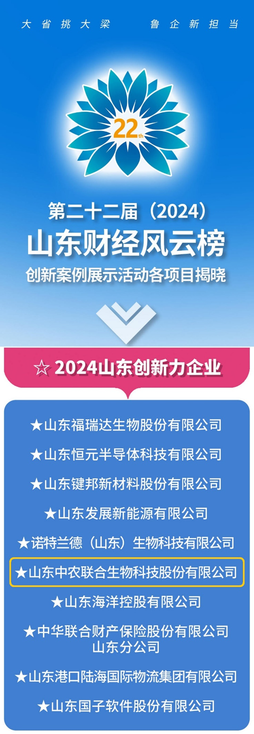 近日,由大众报业集团(大众日报社)主办,山东财经大学、山东省宏观经济研究院、山东省互联网传媒集团、《经济导报》社联合承办的"第二十二届(2024)山东财经风云榜"圆满落幕,重量级榜单正式揭晓。经过严格的资格审查、专家评审等层层筛选,中农联合凭借优秀的创新实力脱颖而出,荣膺"2024山东创新力企业"称号。