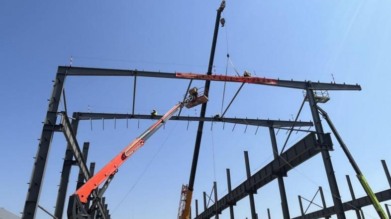 近日,由杭萧钢构(山东)有限公司(以下简称山东杭萧)承建的青岛特锐德电气新型箱式电力设备项目(D厂房)钢结构工程顺利完成首榀屋架梁吊装任务。