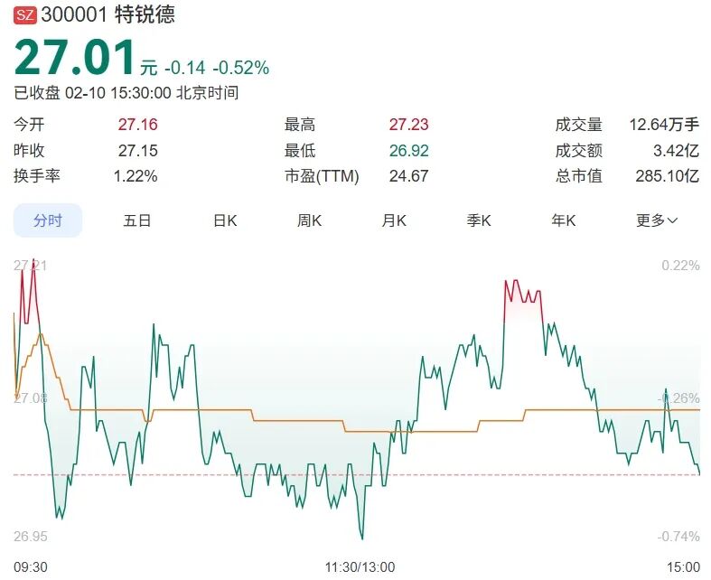 截至2月10日,特锐德报收27.01元/股,总市值285.1亿元。