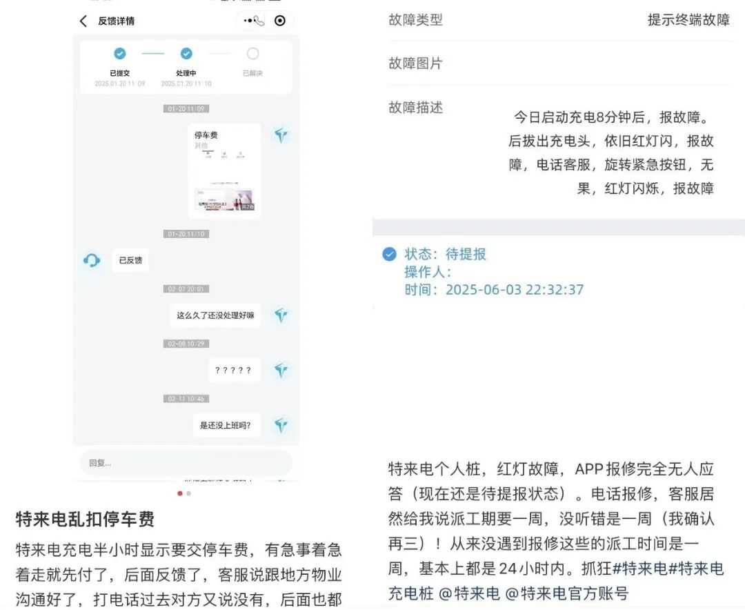 在社媒平台上,有不少用户吐槽特来电存在充电跳枪、充电偷电、客服失联、结算异常等情况;其充电桩质量也频繁被吐槽,比如用户的个人充电桩出现红灯故障、充电过程中断网等。