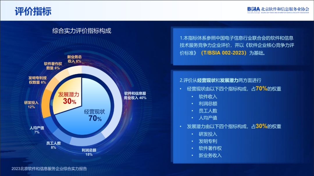 据悉,该名单参照了中国电子信息行业联合会的软件和信息技术服务竞争力企业评价,并以《软件企业核心竞争力评价标准》(T/BSIA 002-2023)为基础,围绕参与企业的经营现状和发展潜力进行综合量化评估。评估主要依据软件收入、利润总额、员工人数、人均产值、研发投入、发明专利、软件著作权、新业务收入共8大指标,其结果充分反映了企业的综合实力。