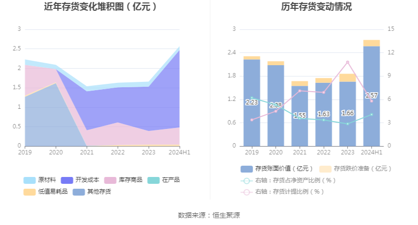从存货变动来看,截至2024年上半年末,公司存货账面价值为2.57亿元,占净资产的4.07%,较上年末增加9120.43万元。其中,存货跌价准备为1581.11万元,计提比例为5.8%。