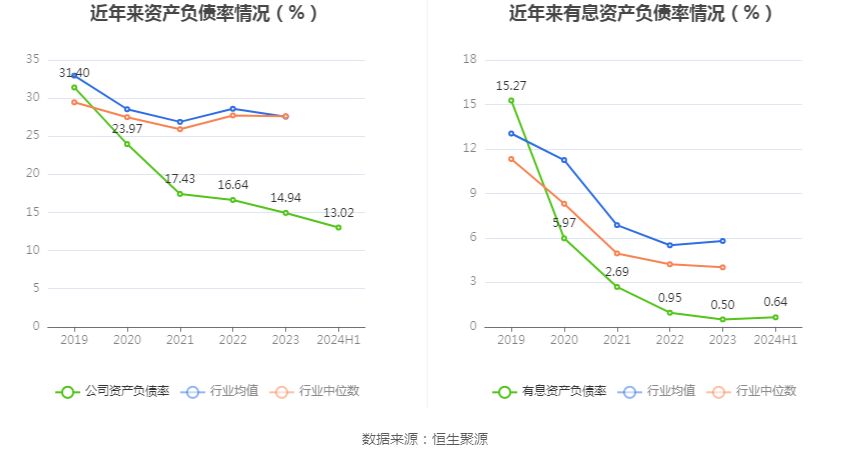 在偿债能力方面,公司2024年上半年末资产负债率为13.02%,相比上年末下降1.92个百分点;有息资产负债率为0.64%,相比上年末上升0.14个百分点。