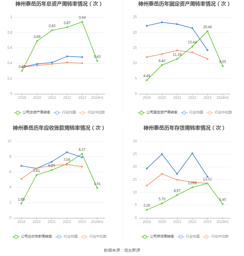 营运能力方面,2024年上半年,公司公司总资产周转率为0.43次,上年同期为0.44次(2023年上半年行业平均值为0.24次,公司位居同行业4/26);固定资产周转率为9.05次,上年同期为10.91次(2023年上半年行业平均值为6.97次,公司位居同行业10/26);公司应收账款周转率、存货周转率分别为3.91次、5.45次。