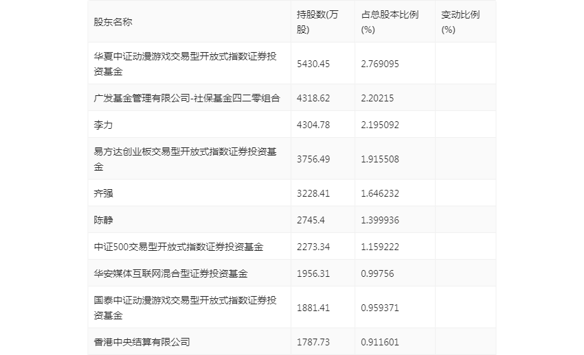 半年报显示,2024年上半年末公司十大流通股东中,新进股东为易方达创业板交易型开放式指数证券投资基金、中证500交易型开放式指数证券投资基金、国泰中证动漫游戏交易型开放式指数证券投资基金,取代了一季度末的宽投幸运星2号私募证券投资基金、磐耀通享15号私募证券投资基金、宽投幸运星3号私募证券投资基金。在具体持股比例上,华夏中证动漫游戏交易型开放式指数证券投资基金持股有所上升,华安媒体互联网混合型证券投资基金、香港中央结算有限公司持股有所下降。