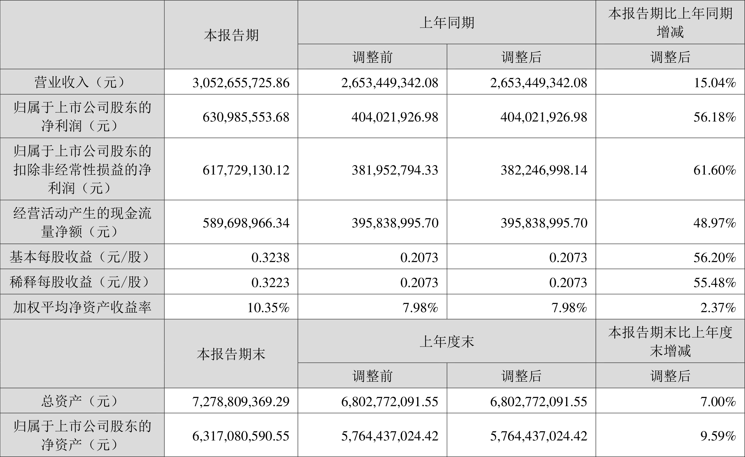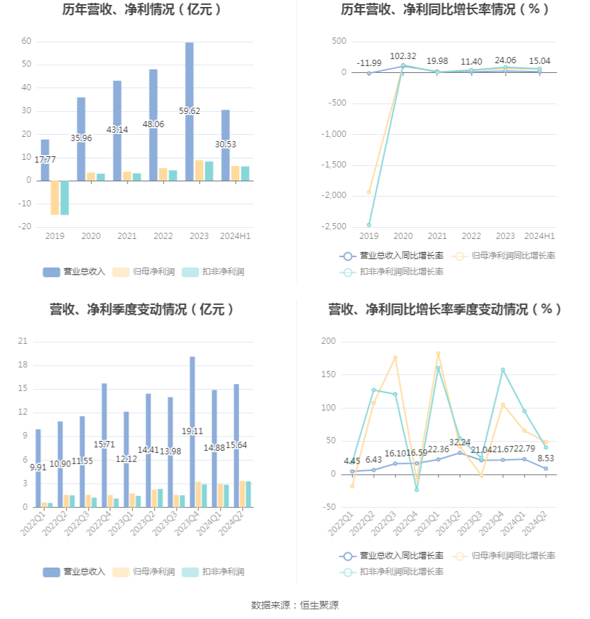 根据半年报,公司第二季度实现营业总收入15.64亿元,同比增长8.53%,环比增长5.13%;归母净利润3.36亿元,同比增长48.73%,环比增长13.88%;扣非净利润3.31亿元,同比增长40.54%,环比增长15.39%。