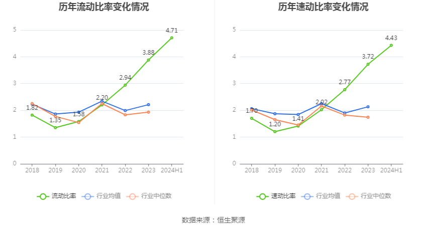 2024年上半年,公司流动比率为4.71,速动比率为4.43。