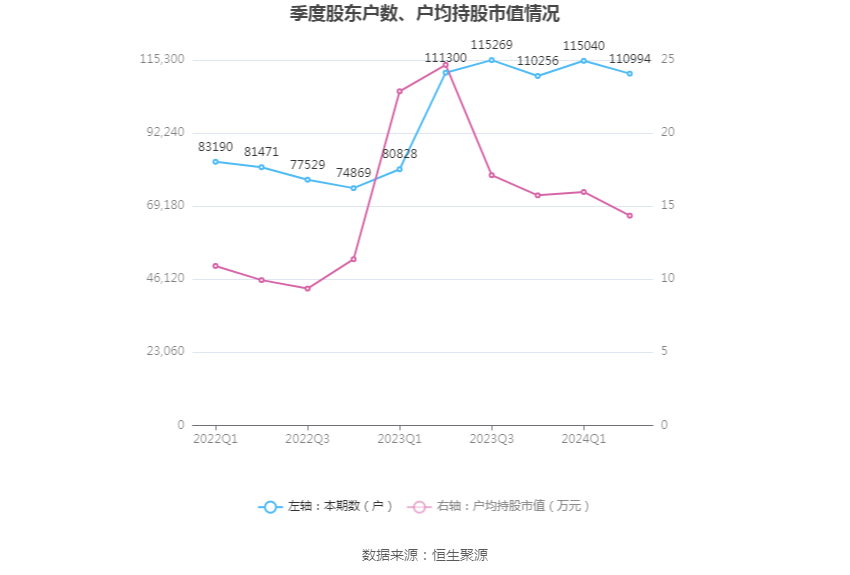 筹码集中度方面,截至2024年上半年末,公司股东总户数为11.1万户,较一季度末下降了4046户,降幅3.52%;户均持股市值由一季度末的15.97万元下降至14.35万元,降幅为10.14%。