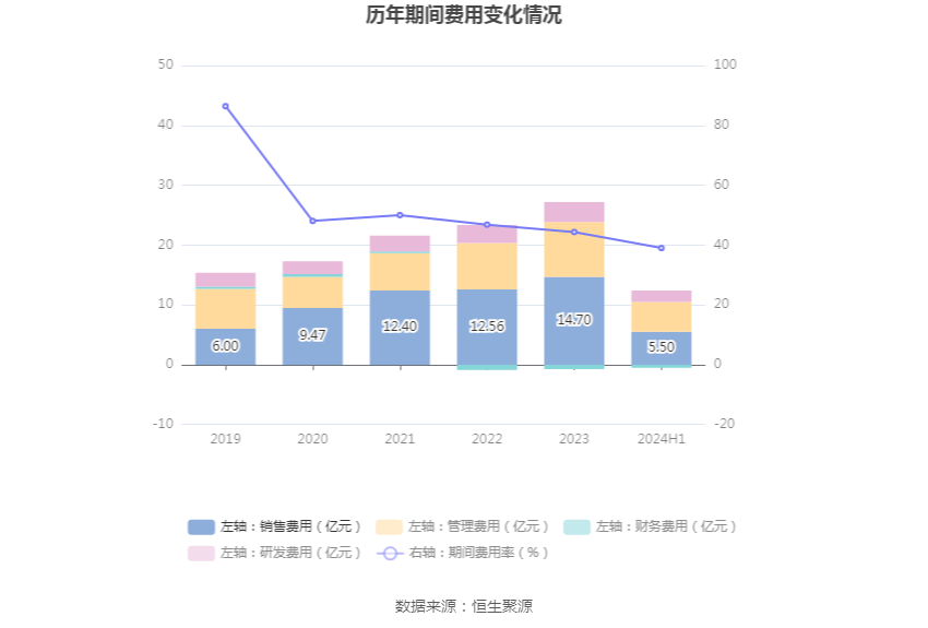 2024年上半年,公司期间费用为11.91亿元,较上年同期增加1815.88万元;但期间费用率为39.00%,较上年同期下降5.18个百分点。其中,销售费用同比下降21.6%,管理费用同比增长42.87%,研发费用同比增长17.57%,财务费用由去年同期的-4325.95万元变为-5222.07万元。