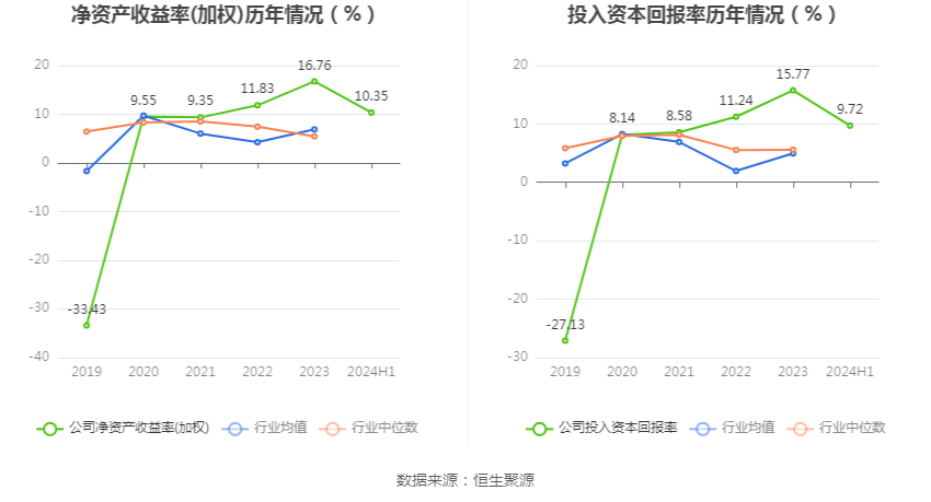 数据显示,2024年上半年公司加权平均净资产收益率为10.35%,较上年同期增长2.37个百分点;公司2024年上半年投入资本回报率为9.72%,较上年同期增长2.22个百分点。
