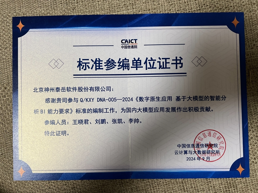 参与《数字原生应用基于大模型的智能分析BI标准》编写