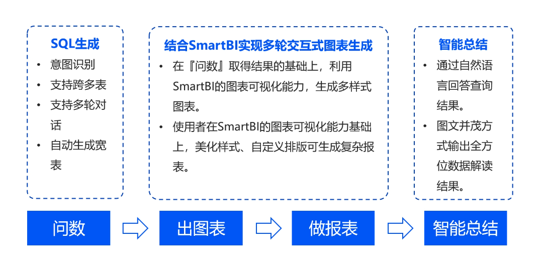 在“AI+智能问数”实践场景下,神州泰岳融合了 Text2SQL + Text2Metrics + Metrics2Data 等多种技术,构建了一个无缝衔接的数据可视化生态系统,让用户通过自然语言交互的方式解析与共享数据价值。用户无需了解数据底层结构,AI能够自主完成多维度的精准解读与分析数据,辅助用户快速了解数据趋势和风险并给出行动建议。