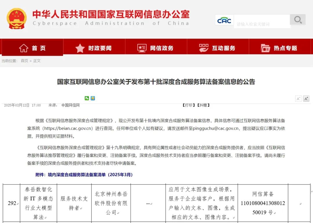 近期,国家互联网信息办公室发布第十批境内深度合成服务算法备案信息,神州泰岳自主研发的数智化新 IT 多模态行业大模型算法成功通过备案。该算法应用于文本图像生成场景,服务于企业端客户,标志着神州泰岳在技术合规性、数据安全性与社会责任履行方面再获权威认可。