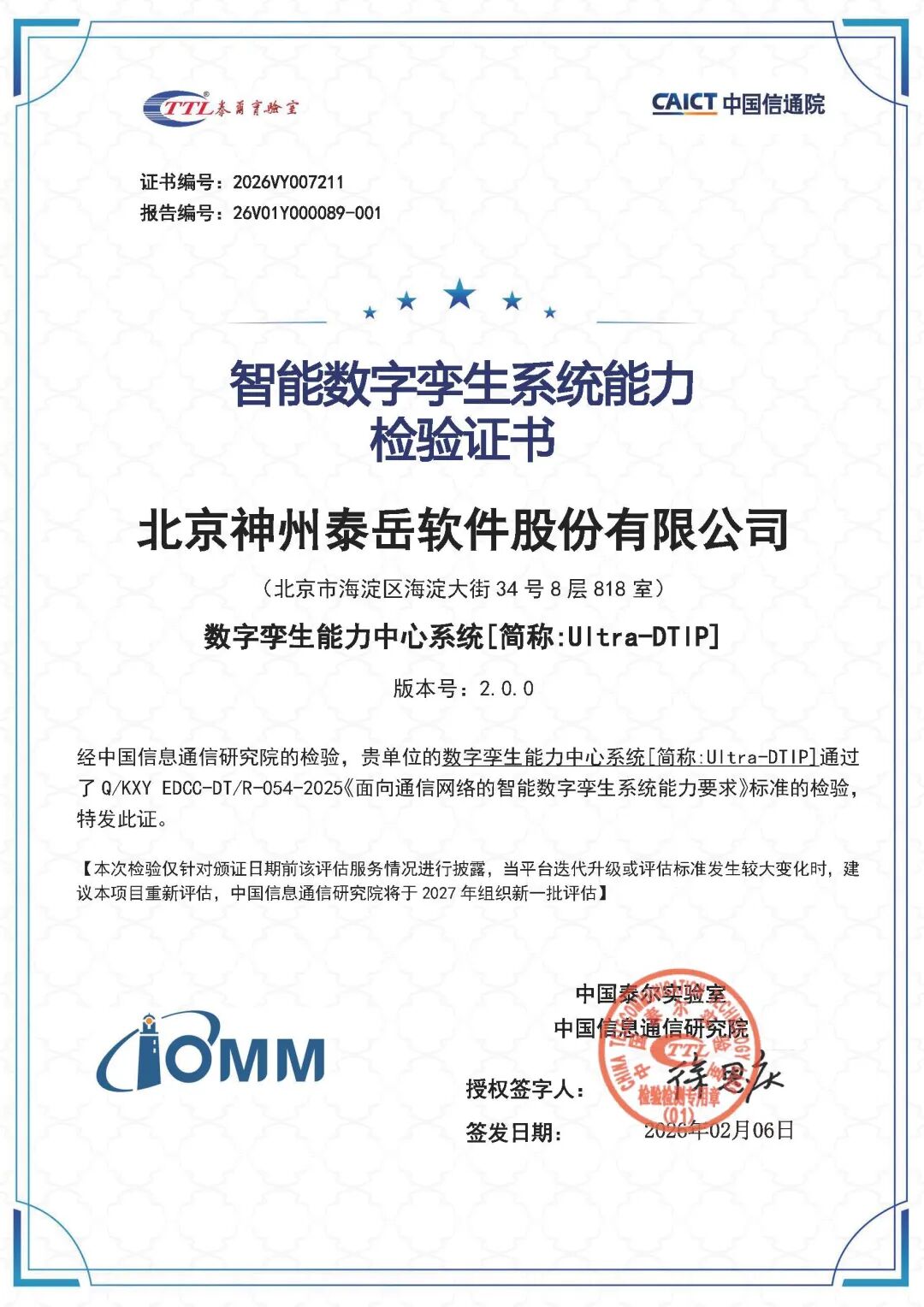 智能数字孪生系统能力检验证书