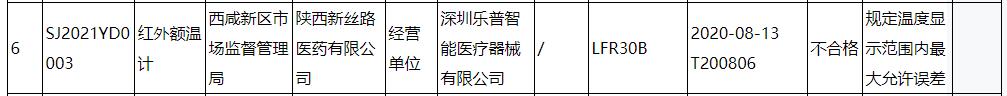 陕西省医疗器械监督抽检不符合标准规定产品名单显示,标示生产企业为深圳乐普智能医疗器械有限公司的红外额温计综合判定不合格,不合格项和主要问题为规定温度显示范围内最大允许误差,被抽查单位为陕西新丝路医药有限公司,抽样地点为经营单位,规格型号为LFR30B,生产日期为2020-08-13,批号为T200806,委托单位为西咸新区市场监督管理局。