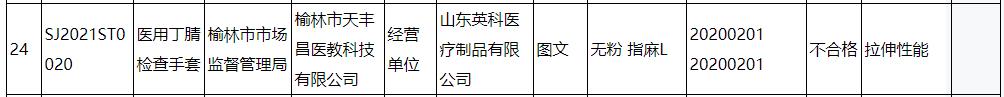 标示生产企业为山东英科医疗制品有限公司的医用丁腈检查手套综合判定不合格,不合格项和主要问题为拉伸性能,被抽查单位为榆林市天丰昌医教科技有限公司,抽样地点为经营单位,规格型号为“无粉指麻L”,生产日期为20200201,批号为20200201,委托单位为榆林市市场监督管理局。