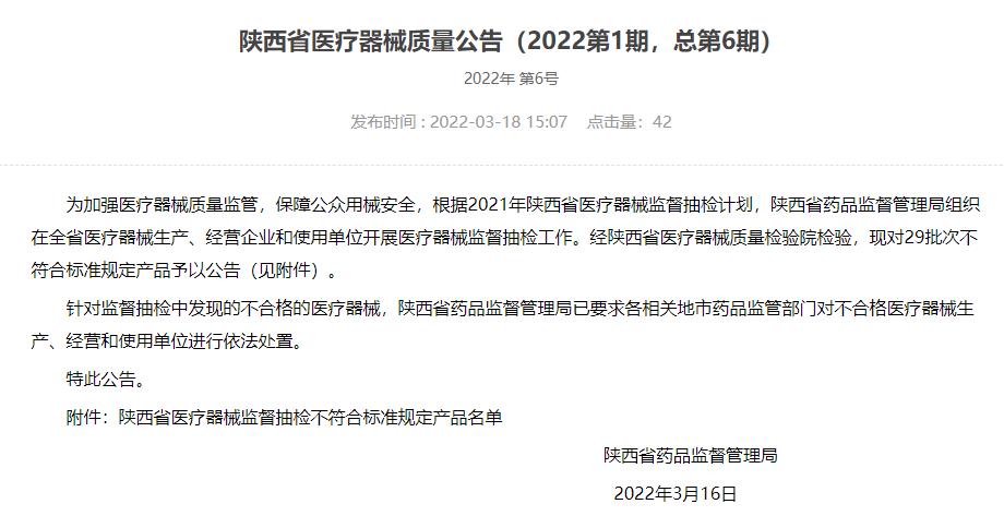 近日,陕西省药品监督管理局公布陕西省医疗器械质量公告(2022第1期,总第6期)。为加强医疗器械质量监管,保障公众用械安全,根据2021年陕西省医疗器械监督抽检计划,陕西省药品监督管理局组织在全省医疗器械生产、经营企业和使用单位开展医疗器械监督抽检工作。经陕西省医疗器械质量检验院检验,现对29批次不符合标准规定产品予以公告。